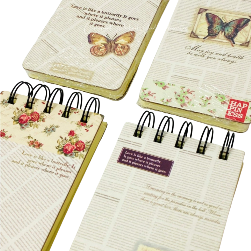 Bloco espiral superior com capa de papel vintage e borboleta decorativa, frase “May joy and health be with you always”.