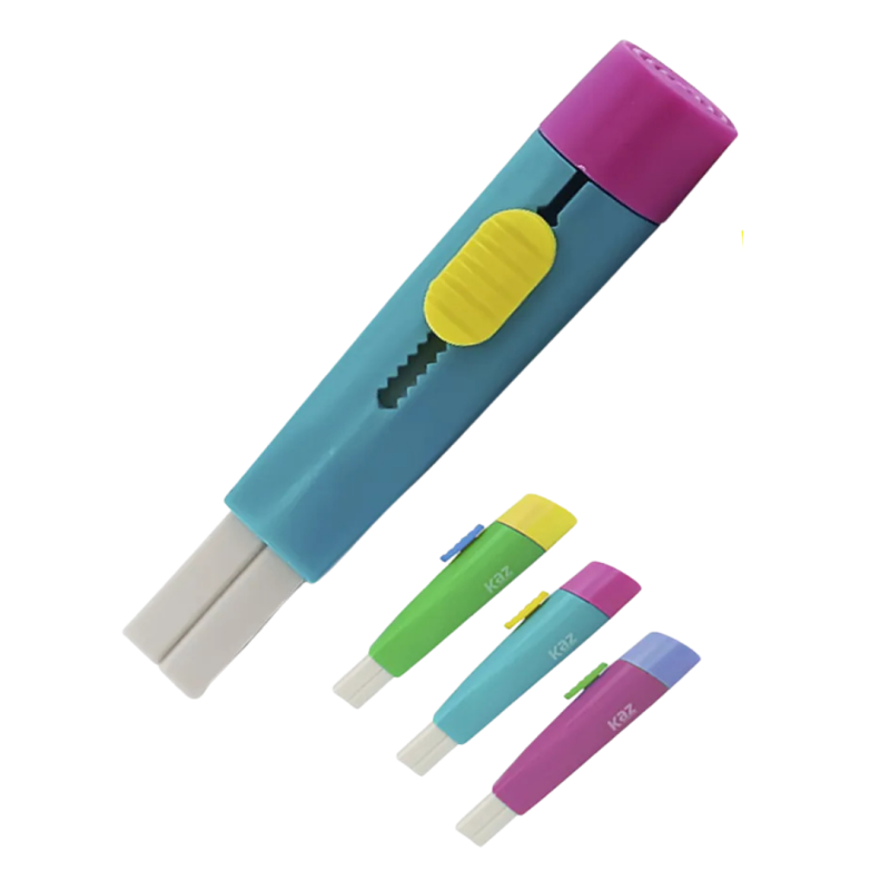 Borracha branca retrátil em formato de estilete, ref. 17623 da marca Kaz, acabamento macio, limpa bem o papel sem sujar — produto escolar ou de escritório.