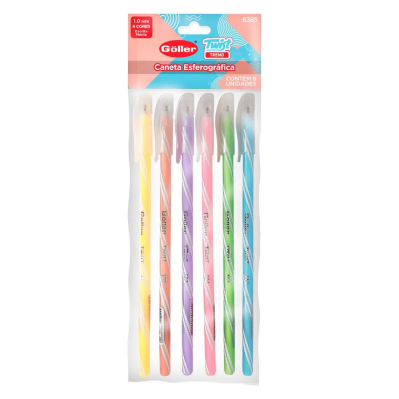Kit com 6 canetas esferográficas “Twist Trend”, ponta 1,0 mm, cores sortidas, para uso diário e escolar.