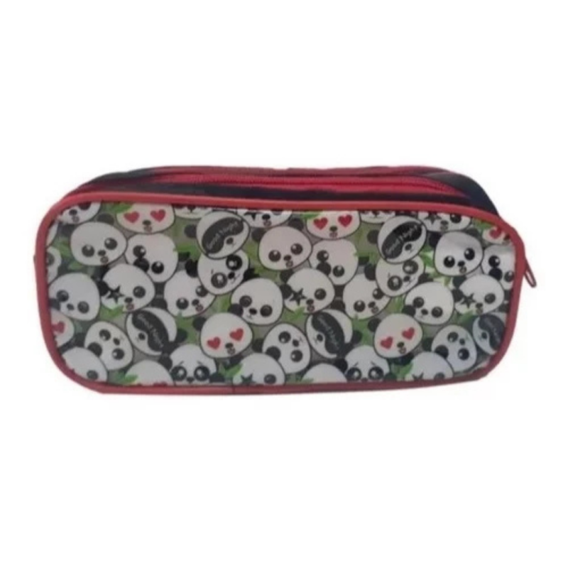 Estojo escolar com 2 divisórias, estampa de panda, fechamento por zíper. Ideal para armazenar lápis, canetas e acessórios escolares.