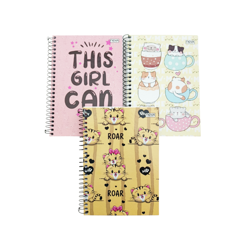 Caderno tamanho A5 com capa dura, 96 folhas, design feminino da linha Nova Mix. Ideal para uso escolar ou anotações diárias.