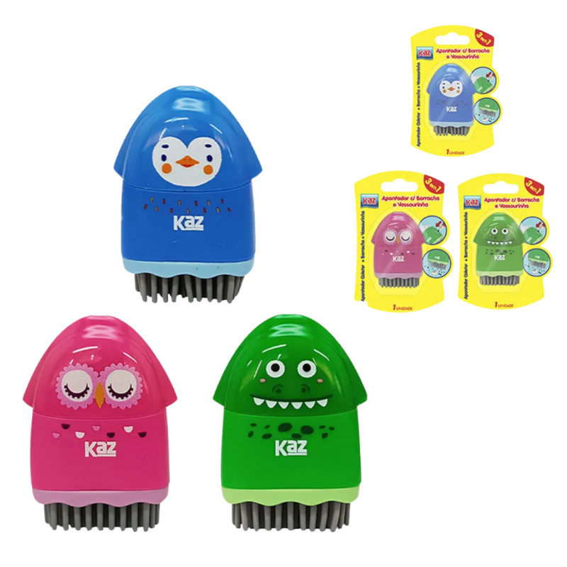Apontador da marca Kaz, inclui compartimento de borracha e design de vassourinha.