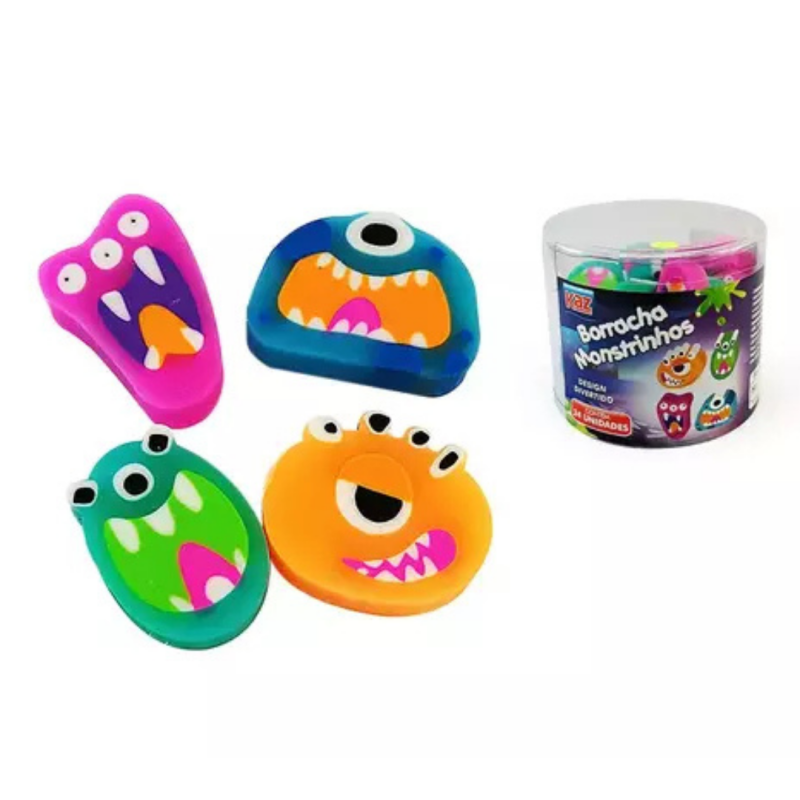 Borracha escolar da marca KAZ, modelo “Monstrinhos”, design divertido, material macio que não suja nem enruga o papel.