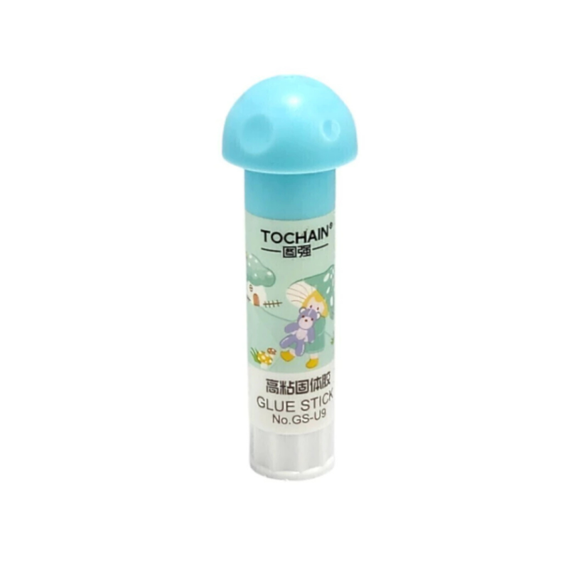 Cola bastão encantadora com tampa em formato de cogumelo, ideal para uso escolar e artesanato.