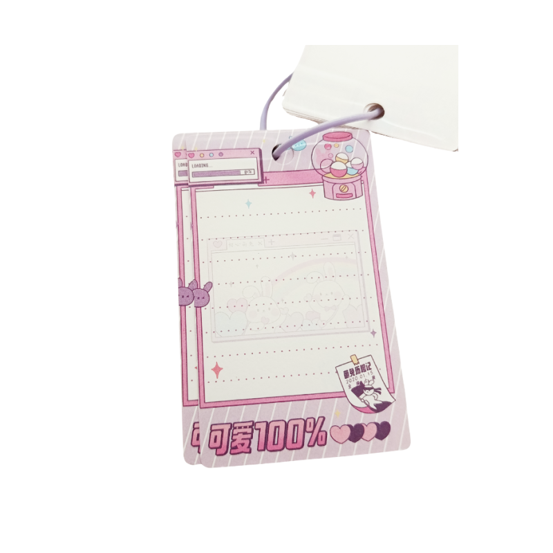 Bloco de notas ilustrado no estilo kawaii, com coelhinhos, arco-íris e corações coloridos. Possui elástico para fechamento e capa com leve brilho perolado. Ideal para anotações rápidas, recadinhos e uso em planners.