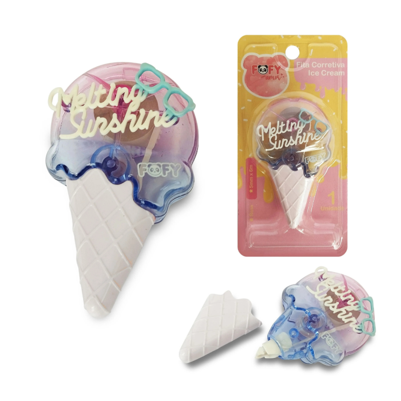 Fita corretiva da linha Fofy, tema Ice Cream (sorvete), medida 5 mm de largura por 8 m de comprimento. Design fofo para agendas, planners e papelaria criativa.