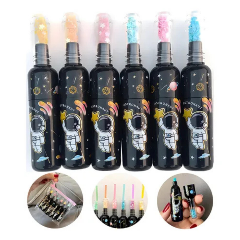 Estojo com 6 marca-texto (highlighters) com temática de planetas e carinhas divertidas, cores vibrantes, ponta chanfrada, ideal para bullet journal, estudo ou uso criativo.
